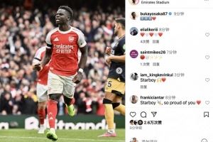 这是萨卡英超第200场里程碑之战,同时也是萨卡英超参与进球数第100个。赛后,萨卡更新社媒晒照纪念自己英超第200次出场,并配文:200场♥️